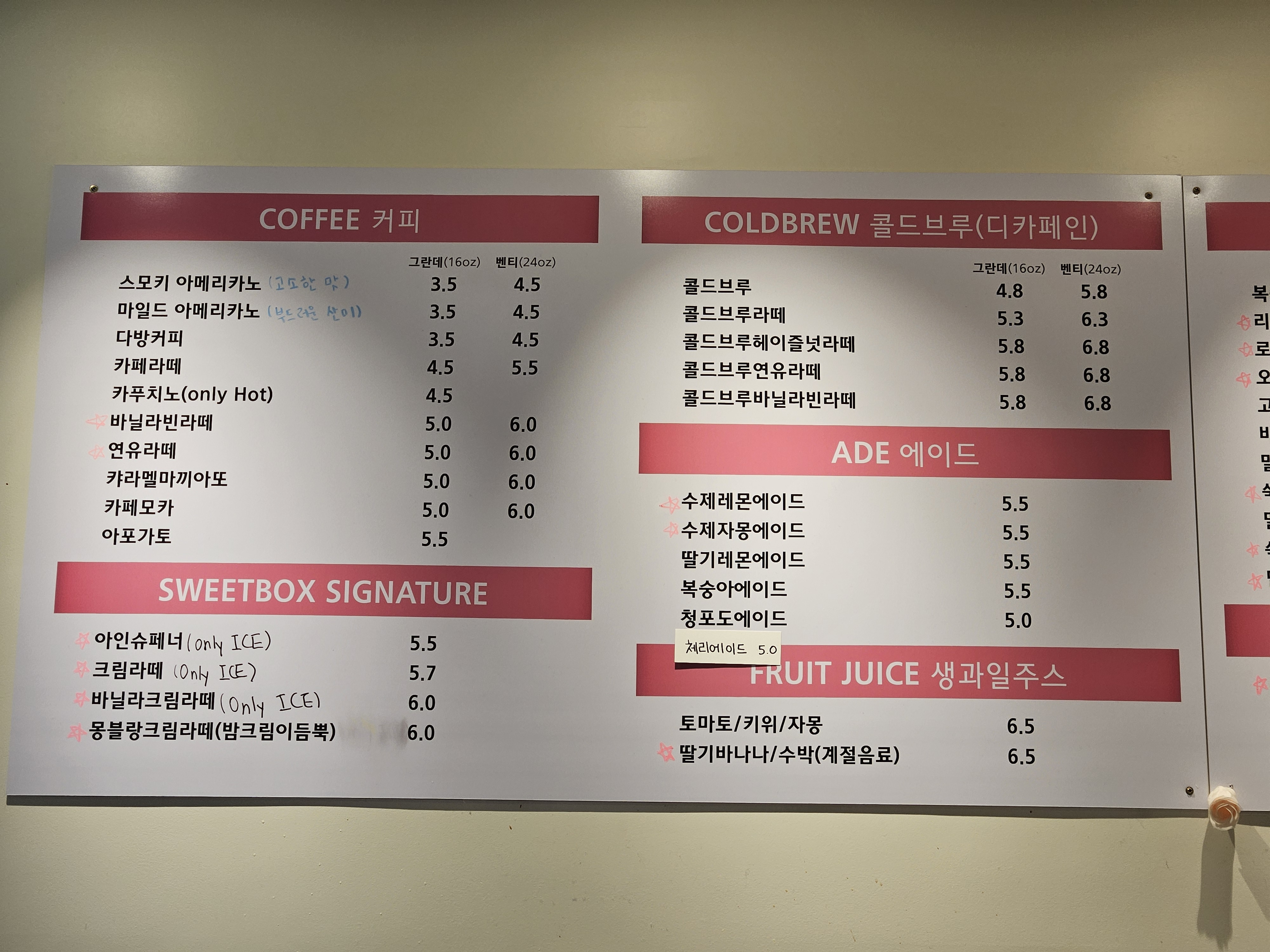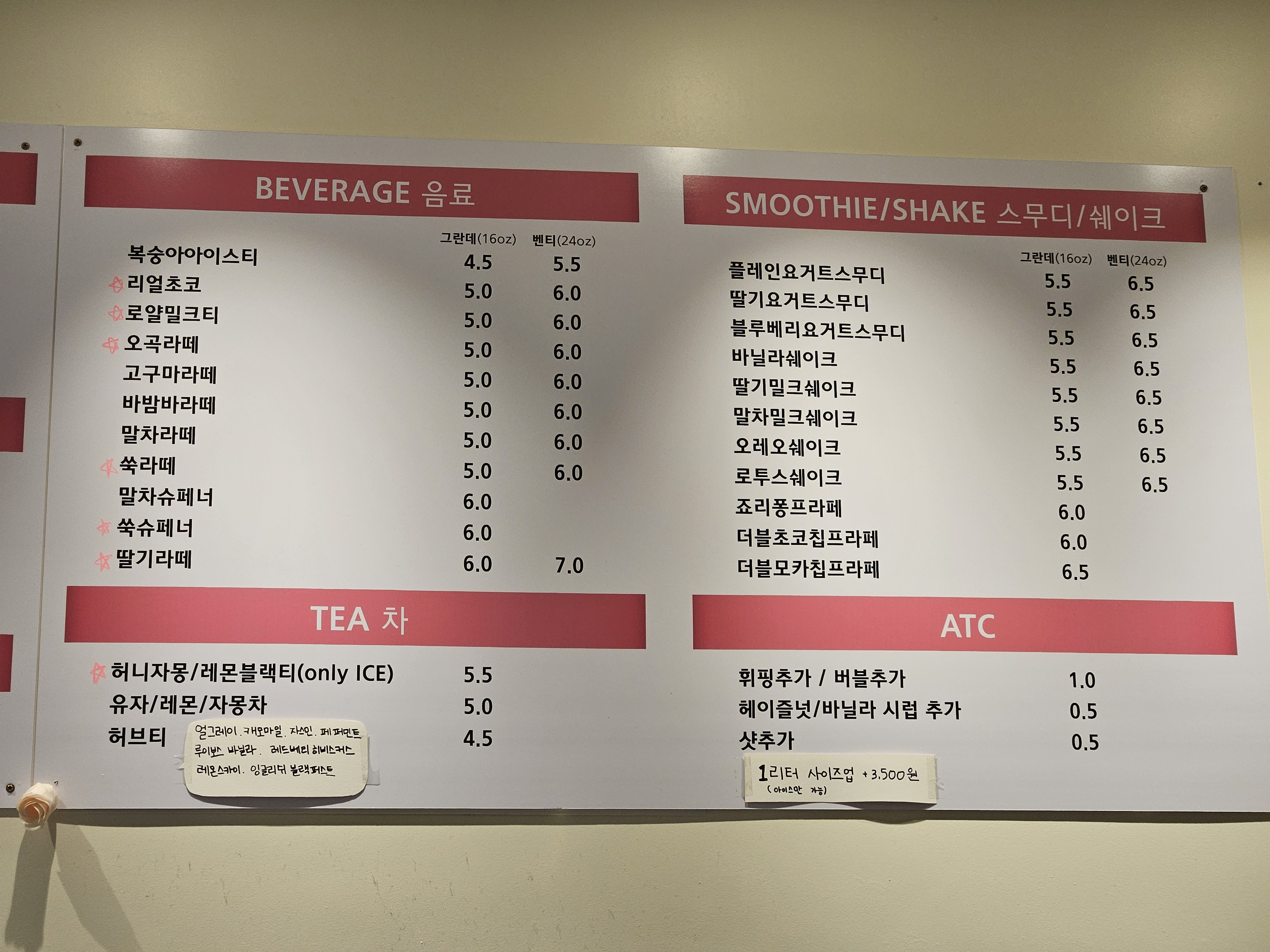 최근엔 여름이라 빙수류와 수박주스도 추가되었어요~